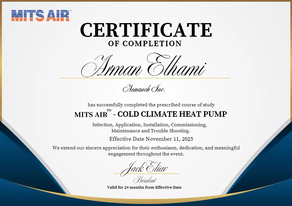 Armanch’s certifications serve as a testament to the expertise and knowledge of our team in HVAC systems. These credentials further enhance our capacity to deliver exceptional services to our clients, ensuring that we uphold the highest standards of quality and professionalism in every project we undertake.